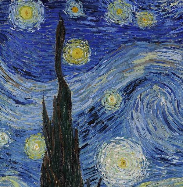 Sin embargo, entre todos estos colores fríos tenemos el amarillo brillante y cálido de las estrellas, la luna, y las ventanas iluminadas. Van Gogh creía profundamente en la complementariedad cromática, es decir, que hay colores que hacen pareja, “se completan como marido y mujer”[3] . Los colores opuestos, como explican en el maravilloso canal Dialogues, raccontare l’Arte, pueden simbolizar la posibilidad de que el yo interior salga de sí y se encuentre, en armonía, con lo que hay afuera, con la naturaleza, con las demás personas. Por otro lado, los colores en la pintura podrían ser interpretados como fuerzas que luchan entre sí, o como ese diminuto anhelo humano de querer tocar las estrellas, su ansia de infinito, encontrándose con el poderío y la indiferencia del cosmos[4]. Pensando en esto, a veces me parece que los poetas y los pintores son solo personas que se atreven a decir lo que todos estamos pensando. ¿No buscamos todos no sentirnos tan solos? Sin escapar de la realidad, ¿cómo la volvemos comprensible, tangible? ¿Cómo hacemos nuestro un universo que puede llegar a ser tan formidable, tan hostil?
