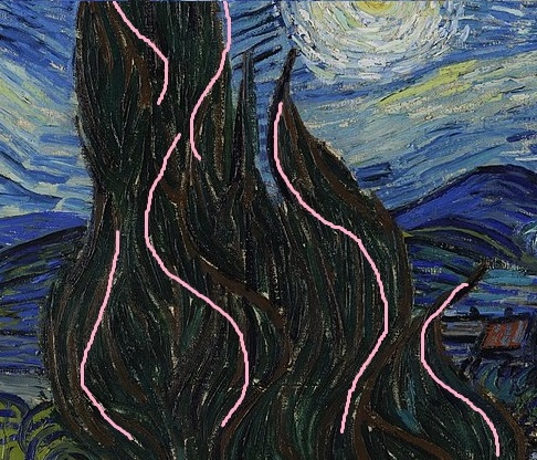 Las pinceladas que utilizó Van Gogh son muy visibles y distintivas, algo característico del movimiento al que pertenece, el Postimpresionismo, nacido a finales del siglo XIX. La textura y la energía que crean estas pinceladas me parece algo maravilloso. Si observamos atentamente, notaremos que hay dos tipos de líneas: por un lado, curvas ondulantes de trazo continuo, como en el caso de los cipreses, y, por otro lado, rayas quebradas, mucho más cortas, como en el caso de los techos de las casas o dentro de las colinas.
